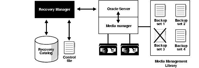 The media manager labels and keeps track of the tape and names of files on each tape. If your site owns an automated tape library with robotic arm, the media manager automatically loads and unloads the tapes required by Oracle; if not, the media manager requests an operator to load a specified tape into the drive.