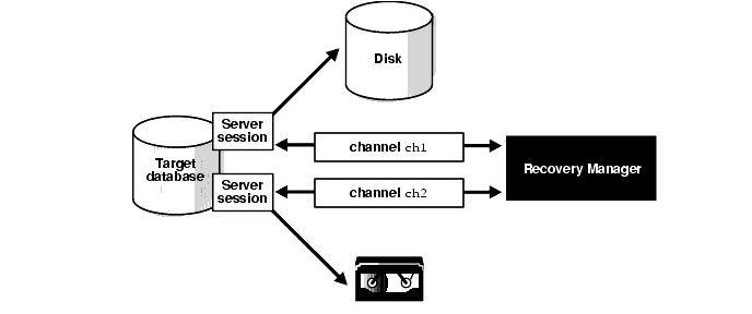 When Recovery Manager executes this command, it sends the backup request to the Oracle server session performing the backup. The Oracle server session identifies the output channel as a media management device and requests the media manager to load a tape and write the output.