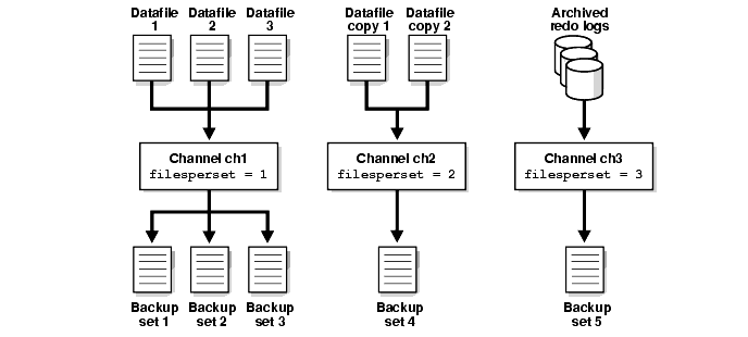 run { allocate channel ch1 type disk; allocate channel ch2 type disk; allocate channel ch3 type disk; backup (datafile 1,2,3 filesperset = 1 channel ch1) (datafilecopy '/oracle/copy/cf.f' filesperset = 2 channel ch2) (archivelog from logseq 100 until logseq 102 thread 1 filesperset = 3 channel ch3); }