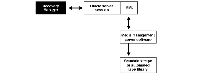 The Oracle executable is the same used when a user connects to the database. The MML in the diagram above represents vendor-supplied media management software that can interface with Oracle. Oracle calls MML software routines to back up and restore datafiles to and from media controlled by the media manager.