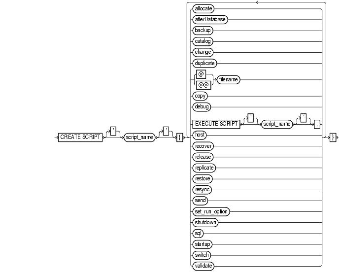 To create a script and store it in the recovery catalog for future reference. Stored scripts provide a common repository for frequently executed collections of RMAN commands: use any command legal within a run command in the script. The script is not executed immediately; use the execute script command (see "run") to run it.