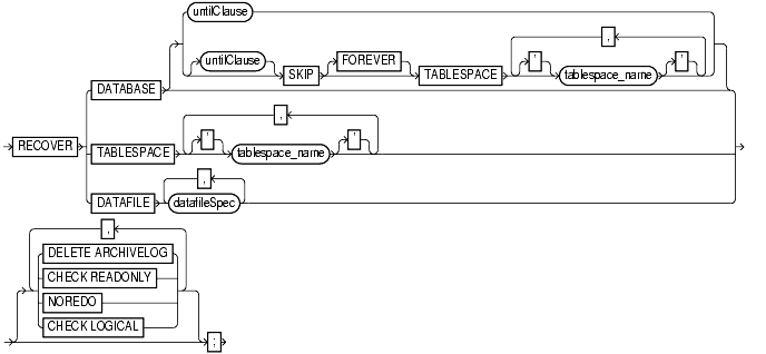specifies that the entire database is to be recovered. You can specify an optional untilClause that causes the recovery to stop when the specified condition has been reached. |