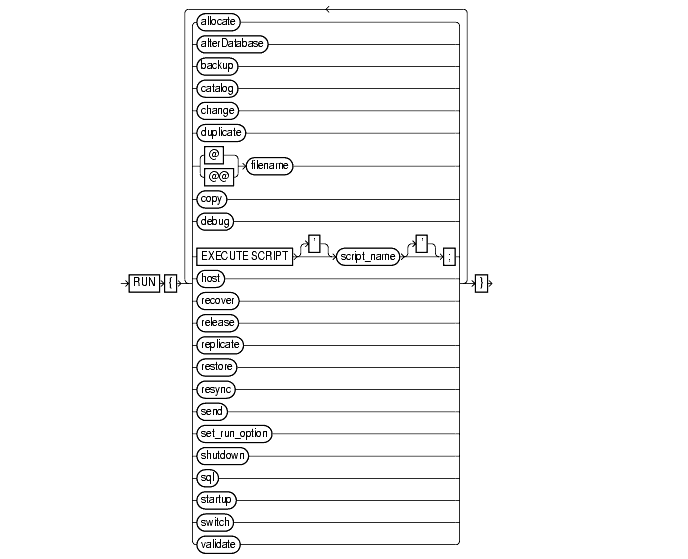 runs the specified stored script. To obtain a listing of all stored scripts, use SQL*Plus to connect to the recovery catalog database as the catalog owner and issue the following query: select * from rc_stored_script; See Also: "RC_STORED_SCRIPT" for more information about RC_STORED_SCRIPT, and "createScript" for information about creating scripts. |
