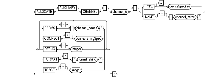 specifies a connection between RMAN and the target database instance. Each connection initiates an Oracle server session on the database instance: this server session performs the work of backing up, restoring, and recovering backups and copies. Specify a channel id, which is the name of the channel, after the channel keyword. Oracle uses the identifier with the release channel command and to report I/O errors. |
