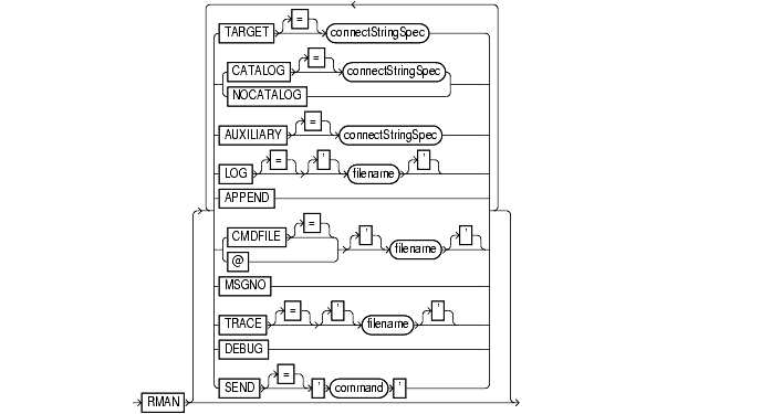 runs a file containing a user-defined list of RMAN commands. If the first character of the filename is alphabetic, then you can omit the quotes around the filename. The contents of the command file should be identical to commands entered at the RMAN prompt. For example, the following file contents will cause RMAN to connect to a target database and recovery catalog RCAT: connect target; connect catalog rman/rman@rcat; RMAN terminates after running the command file. |