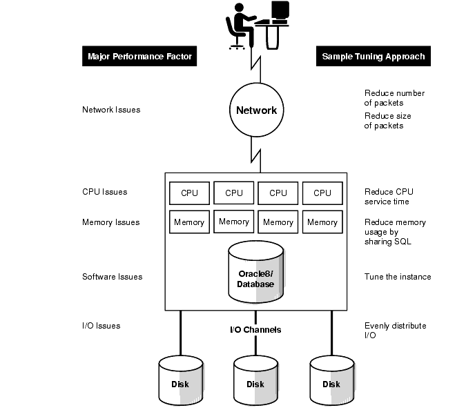 Figure 16-1 illustrates the factors involved in Oracle system performance for well designed applications.