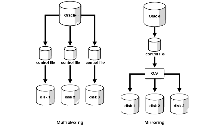 As with online redo log files, Oracle allows you to multiplex control files, that is, configure Oracle to open and write to multiple, identical copies. Oracle writes the same data to each copy of the control file. You can also mirror them, that is, allow the operating system to write a copy of a control file to two or more physical disks. Oracle corporation recommends that you both multiplex and mirror the control files.