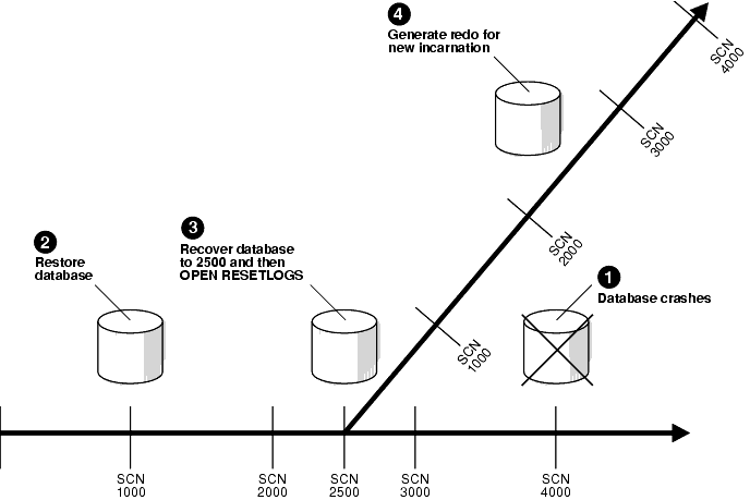Figure 5-1 shows the case of a database that can only be recovered to SCN 2500 because an archived redo log is missing. At SCN 4000, the database crashes. You restore the SCN 1000 backup and prepare for complete recovery. Unfortunately, one of your archived redo logs is corrupted. The log before the missing log contains SCN 2500, so you recover to this point and open with the RESETLOGS option.