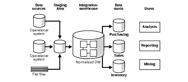 Figure 1-3 illustrates a more complex data warehouse environment. In addition to a central database, there is a staging system used to cleanse and integrate data, as well as multiple data marts, which are systems designed for a particular line of business.