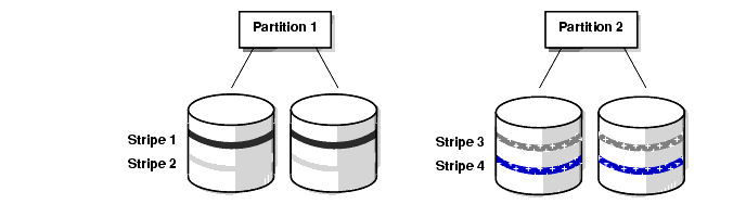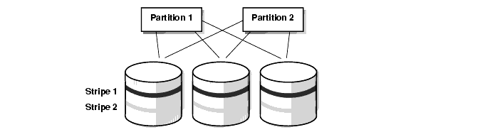 Global striping, illustrated in Figure 4-3, entails overlapping disks and partitions.