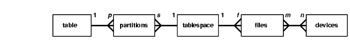 There are a maximum of t partitions, every partition in its own tablespace, f files in each tablespace, each tablespace on a striped device:
