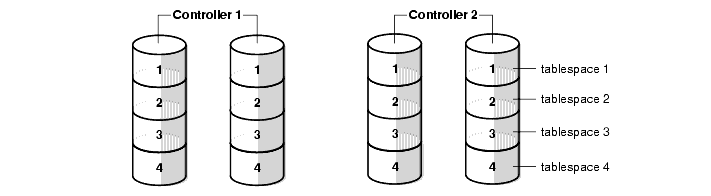 To avoid I/O bottlenecks during parallel processing or concurrent query access, all tablespaces accessed by parallel operations should be striped. As shown in Figure 4-1, tablespaces should always stripe over at least as many devices as CPUs; in this example, there are four CPUs.