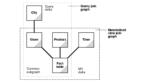 A query delta join is a join that appears in the query but not in the materialized view. Any number and type of delta joins in a query are allowed and they are simply retained when the query is rewritten with a materialized view. Upon rewrite, the materialized view is joined to the appropriate tables in the query delta.