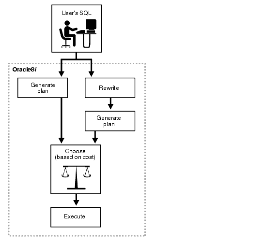 The Oracle optimizer uses two different methods to recognize when to rewrite a query in terms of one or more materialized views. The first method is based on matching the SQL text of the query with the SQL text of the materialized view definition. If the first method fails, the optimizer uses the more general method in which it compares join conditions, data columns, grouping columns, and aggregate functions between the query and a materialized view.