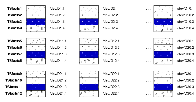 CREATE TABLESPACE Tsfacts1 DATAFILE /dev/D1.1' SIZE 1024MB REUSE DATAFILE /dev/D2.1' SIZE 1024MB REUSE DATAFILE /dev/D3.1' SIZE 1024MB REUSE DATAFILE /dev/D4.1' SIZE 1024MB REUSE DATAFILE /dev/D5.1' SIZE 1024MB REUSE DATAFILE /dev/D6.1' SIZE 1024MB REUSE DATAFILE /dev/D7.1' SIZE 1024MB REUSE DATAFILE /dev/D8.1' SIZE 1024MB REUSE DATAFILE /dev/D9.1' SIZE 1024MB REUSE DATAFILE /dev/D10.1 SIZE 1024MB REUSE DEFAULT STORAGE (INITIAL 100MB NEXT 100MB PCTINCREASE 0) CREATE TABLESPACE Tsfacts2 DATAFILE /dev/D4.2' SIZE 1024MB REUSE DATAFILE /dev/D5.2' SIZE 1024MB REUSE DATAFILE /dev/D6.2' SIZE 1024MB REUSE DATAFILE /dev/D7.2' SIZE 1024MB REUSE DATAFILE /dev/D8.2' SIZE 1024MB REUSE DATAFILE /dev/D9.2' SIZE 1024MB REUSE DATAFILE /dev/D10.2 SIZE 1024MB REUSE DATAFILE /dev/D1.2' SIZE 1024MB REUSE DATAFILE /dev/D2.2' SIZE 1024MB REUSE DATAFILE /dev/D3.2' SIZE 1024MB REUSE DEFAULT STORAGE (INITIAL 100MB NEXT 100MB PCTINCREASE 0) ... CREATE TABLESPACE Tsfacts4 DATAFILE /dev/D10.4' SIZE 1024MB REUSE DATAFILE /dev/D1.4' SIZE 1024MB REUSE DATAFILE /dev/D2.4' SIZE 1024MB REUSE DATAFILE /dev/D3.4 SIZE 1024MB REUSE DATAFILE /dev/D4.4' SIZE 1024MB REUSE DATAFILE /dev/D5.4' SIZE 1024MB REUSE DATAFILE /dev/D6.4' SIZE 1024MB REUSE DATAFILE /dev/D7.4' SIZE 1024MB REUSE DATAFILE /dev/D8.4' SIZE 1024MB REUSE DATAFILE /dev/D9.4' SIZE 1024MB REUSE DEFAULT STORAGE (INITIAL 100MB NEXT 100MB PCTINCREASE 0) ... CREATE TABLESPACE Tsfacts12 DATAFILE /dev/D30.4' SIZE 1024MB REUSE DATAFILE /dev/D21.4' SIZE 1024MB REUSE DATAFILE /dev/D22.4' SIZE 1024MB REUSE DATAFILE /dev/D23.4 SIZE 1024MB REUSE DATAFILE /dev/D24.4' SIZE 1024MB REUSE DATAFILE /dev/D25.4' SIZE 1024MB REUSE DATAFILE /dev/D26.4' SIZE 1024MB REUSE DATAFILE /dev/D27.4' SIZE 1024MB REUSE DATAFILE /dev/D28.4' SIZE 1024MB REUSE DATAFILE /dev/D29.4' SIZE 1024MB REUSE DEFAULT STORAGE (INITIAL 100MB NEXT 100MB PCTINCREASE 0)