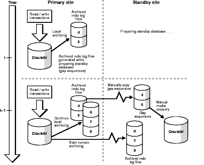 If you violate either of these two rules, then the standby database is down while the primary database is open and archiving. Consequently, Oracle can create a gap sequence. When you restart the standby database later, you must synchronize the standby database manually with the primary database before you can initiate managed recovery.