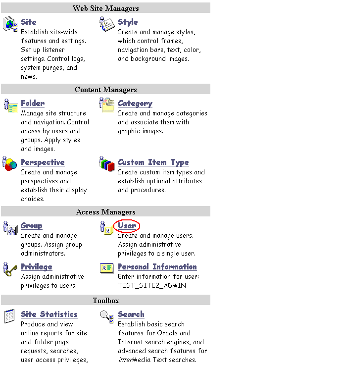 Let's log on to the site you just created and assign MILLER, the user you created in Section 1.2, "Creating a New User", as a site administrator.