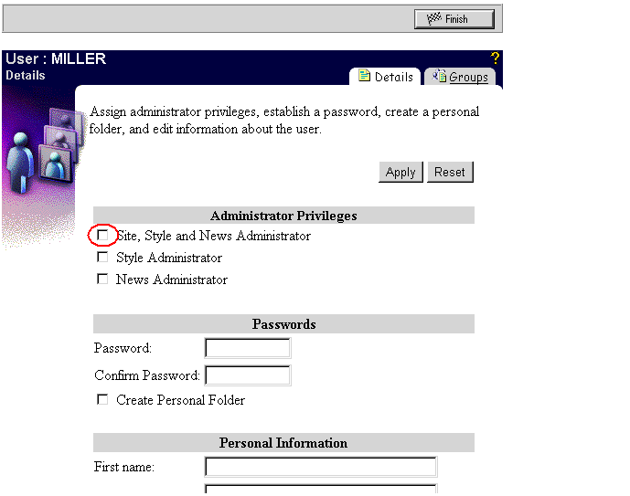 - In the Administrator Privileges section, check Site, Style and News Administrator.