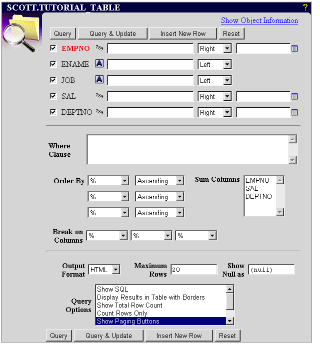 The form on the Query and Update page is divided into three sections. The first section lists the columns in the table. You can type values in the fields to specify query criteria or to add new data. The second and third sections of the form enable you to specify the way the query results are displayed. For example, you can order the results by a specified column, or download the results and display them in Microsoft Excel.