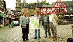 Übergabe vor historischer Fachwerkkulisse. Von links; Bürgermeister Dieter Schmidt, Joachim Könicke, Dr. Lutz Münzer und Erwin Wißner.