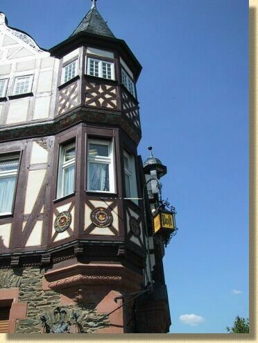 den Rosetten am Ecktürmchen des Postgebäudes sind die Namen der wichtigsten beteiligten Handwerker eingeschnitzt. Balkon