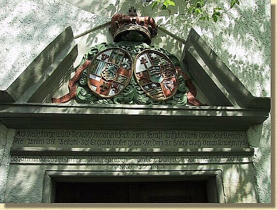 | Beachtenswert ist der Barockportalschmuck des Haupteingangs (Graf Wilhelm Moritz von Solms-Braunfels, Landgräfin Sophie Magdolena von Hessen-Bingenheim). Der auf dem Dach befindliche Turmhahn von 1933 ist der stattlichste des Solmser Landes. | |