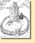 Miterwerb des Greifensteins Wohnburg mit Bergfried (Altem Stock), Palas (Rittersaal), Schildmauer, Torturm (um 1722 abgerissen) und Nordturm (ehemaliger Wartturm, heute Friedrichsturm) um 1300 (Rekonstruktion C. Seiler) |