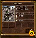 Wolf Rider/Wolf Raider Like so many other stronghold creatures, the wolf rider has good attack but weak defense. The hit points for the wolf rider are laughably low for its level and because it always charges into the thick of battle, you will always have high wolf rider casualties. But, this unit is designed for quick strikes, with little consideration to the deaths that will inevitably result. While the wolf rider is a fairly good unit, the upgraded wolf raider is much more effective. This should be your first stronghold upgrade, as the wolf raider gains a higher attack, speed, and two attacks. While not as fast as the obsidian gargoyle or harpy hag, the wolf raider does have good speed and can strike with lethal results. If Heroes III has a shock troop, this is it. The two strikes allow it to effectively double its damage, and the higher minimum damage ensures that the attack delivers a scathing blow. However, often times, if you are attacking a large stack of units, you might not be able to deliver the second attack because the wolf raider's hit points are so low. Increase their defense with stone skin and shield. Although you should definitely upgrade and use these creatures, don't expect many to survive your battles. These creatures seem ideal for engaging ranged units but are particularly vulnerable to attacks from marksmen, magogs, and grand elves.