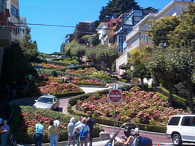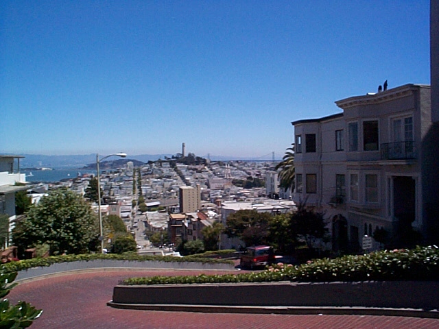 Looking down on Lombard Street gives a nice view of San Francisco Bay, Treasure Island, Coit Tower, and the Bay Bridge: