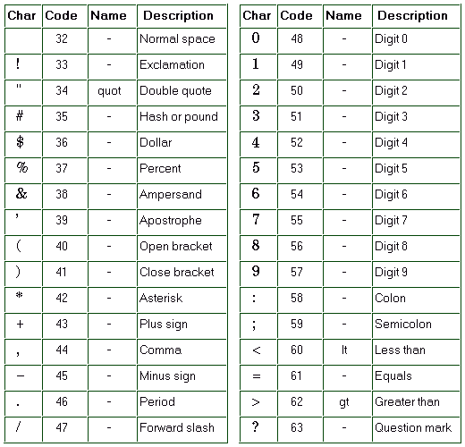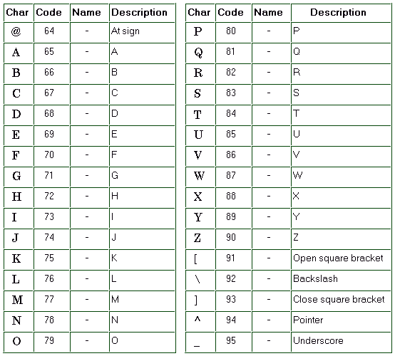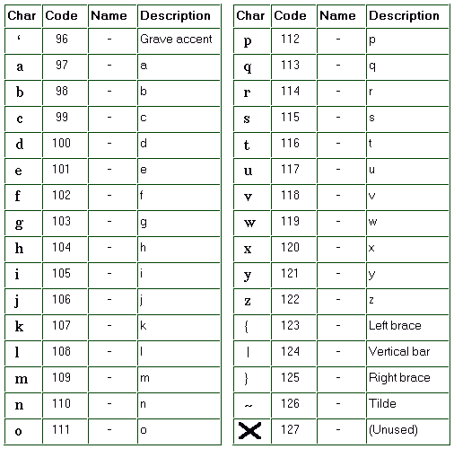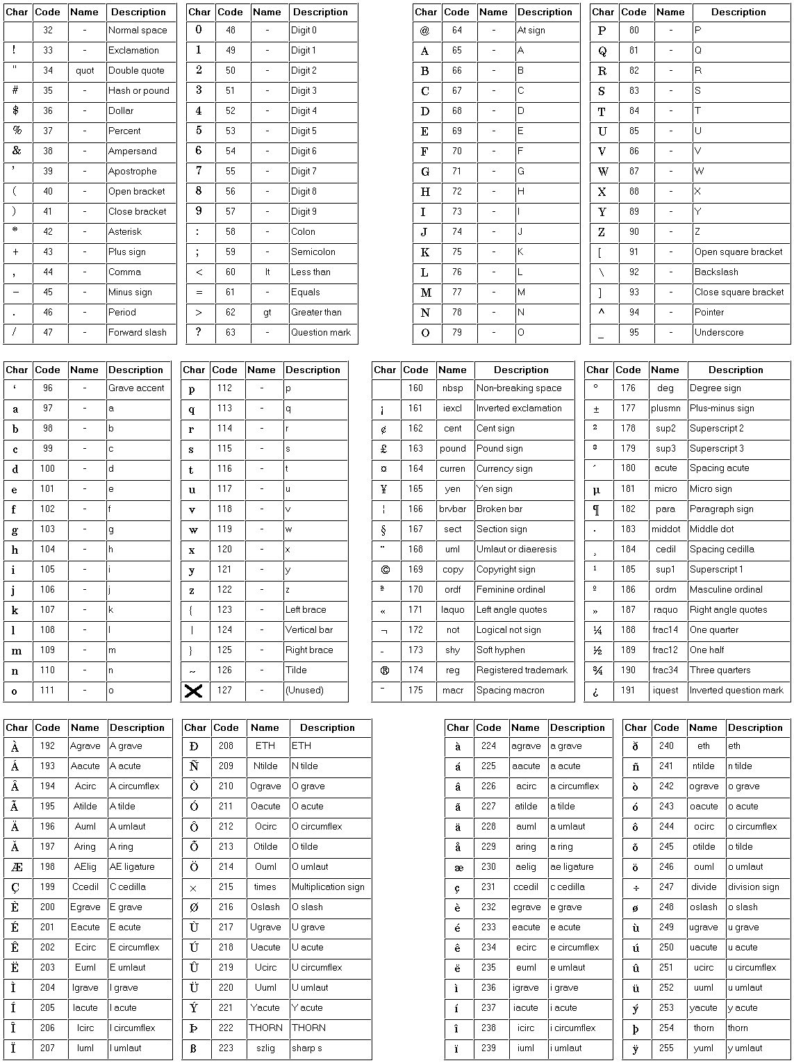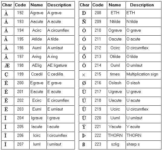 The following tables give all characters which are available in the ISO Latin 1 character set. In each table, you will see four columns: