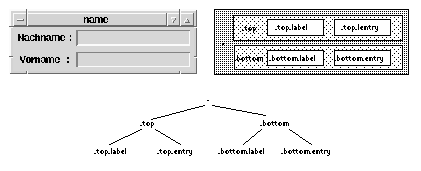 Die einzelnen Fenster (Widgets) einer Applikation sind in einer baumartigen Struktur angeordnet. Als oberste Ebene dient das Toplevel-Window, welches alle anderen Widgets beinhaltet. Dieses Toplevel-Window ist ein direkter Nachfolger des Root-Windows und wird somit vom Window-Manager ( fvwm, olvwm, mwm etc.) mit einem Rahmen versehen (dekoriert), welcher über seine Steuerelemente Manipulationen an diesem Fenster gestattet (iconifizieren, vergrößern). Jedes Fenster besitzt somit ein Vaterfenster an dem es sich bezüglich seiner Ausrichtung orientiert, daher muß auf eine sinnvolle Gestaltung dieser Widgethierarchie geachtet werden um ein vernünftiges Layout zu erhalten.