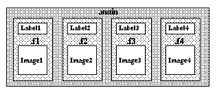 Um das in Abbildung 3.6 dargestellte Layout zu realisieren, muß das Hauptfenster spaltenweise in Frames unterteilt (Ressource -side left), damit über jedem Icon ein zentrierter Text dargestellt werden kann ( anders ist keine genaue Ausrichtung möglich). In diese Frames wird anschließend der Text und darunter das Icon (Image) gepackt (Ressource -side top).