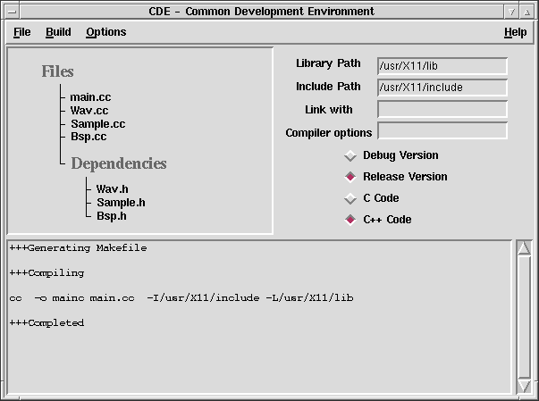 Über den Menüpunkt Build kann das Projekt compiliert, das compilierte Programm gestartet oder debuggt werden. Außerdem können über update Dependencies\ die Abhängigkeiten neu erzeugt werden und mit delete Objekts die Objektdateien gelöscht werden. Beim Compilieren wird zuerst aufgrund des Arrays dep ein Makefile generiert und anschließend mit dem Programm make die Binärdatei erzeugt. Die Ausgabe von make wird in das Text-Widget unterhalb des Canvas-Widgets umgeleitet um dem Anwender eventuelle Fehlermeldungen anzuzeigen.