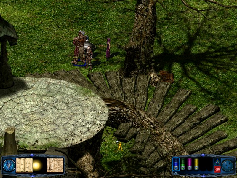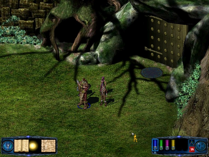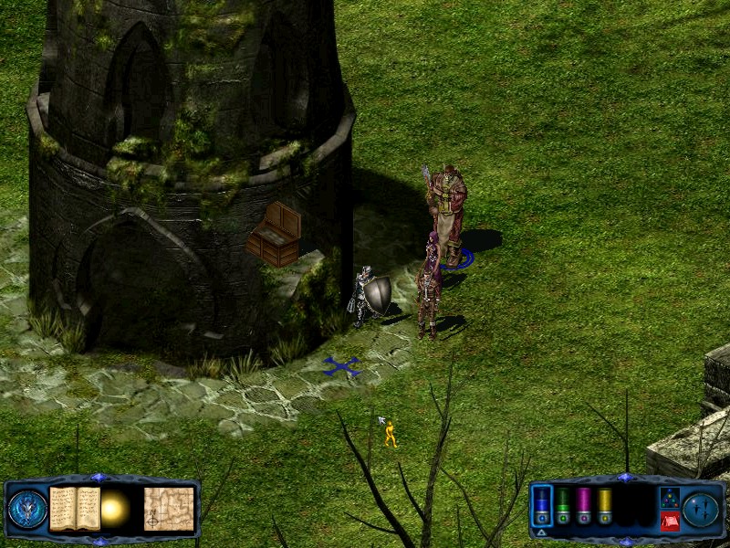 Cross the bridge and head north until you reach the edge of the area and follow the wall east. You will soon come across a zombie and a skeleton. Once the battle is over continue following the wall until you reach three more skeletons. Just behind these skeletons is another wall blocking further travel east. Follow the building to the south until you reach the foot of the steps. Now turn your party west again and travel to the river. Just to the south you will see the top of another building. Follow the river until you reach it - battling two orcs on your way. You will find a raised platform with a tree just to the north of it. Under the tree is an empty chest and another orc. |