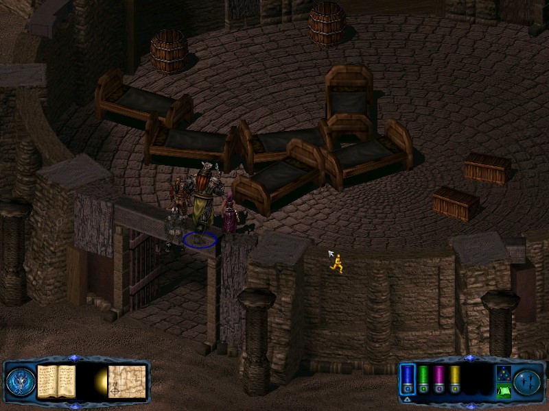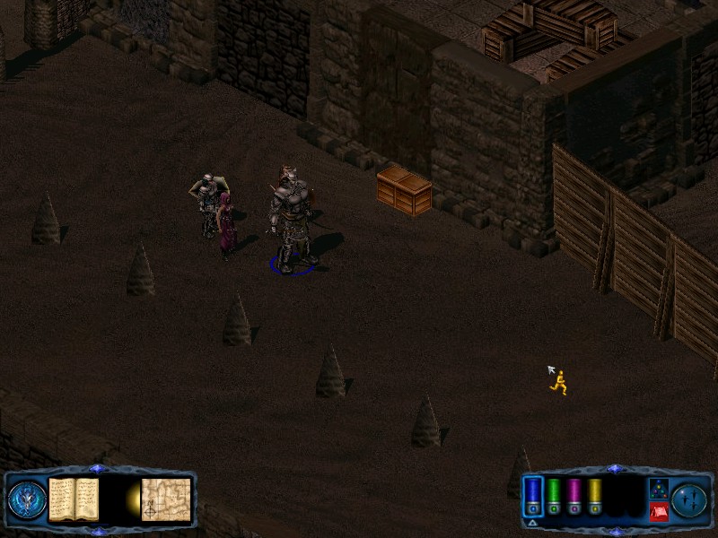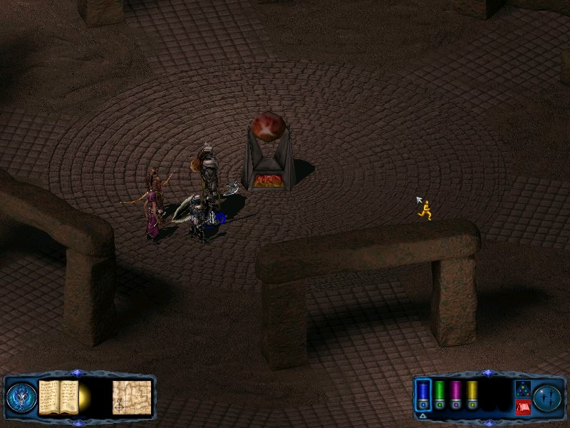 Return to the nearest junction and this time take the NE passage to the dwarven tombs. Go first to the centre of the main room there is an altar you can touch to get an impression of past ceremonies that were held there. From this altar head directly south to find a door. Inside you will find 2 ghouls in open cages. Shut the doors on them and open the two trapped chests. These chests trigger fire beneath the ghouls that kills them. Each chest holds a scroll of harm, a scroll of heal and a stone idolon.