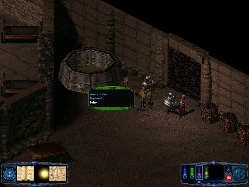 Follow the eastern wall north again, round it at the top and start south once more. Not far along you will spot a gate on the eatern side of the passage. Open the gate and go inside to find a safe place to rest. On the table you will find a blunted dagger of armour. There is also some gold in the well.