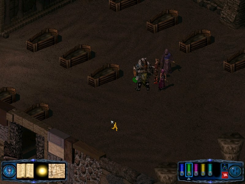 Now take the stairs in the SW down. You will arrive in a room full of coffins. The door is to your west. 3 ghouls wait beyond it, with 2 skeletons and 2 zombies in the room after that. There are 3 rooms joined to the main room. The southern and NW rooms are empyt, but the NE door, protected by 2 zombies and a ghoul, contains a chest. Before retirieving the chest, however you'll need to fight off 2 more skeletons and a wraith. Your reward for all this? A scroll of chill touch and a scroll of spiritual weapon dropped by the undead and a serpent's ring in the chest.