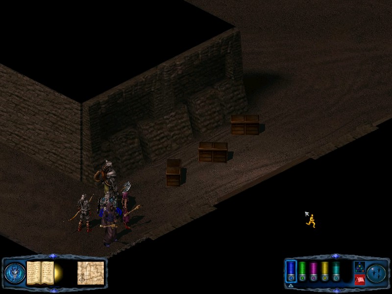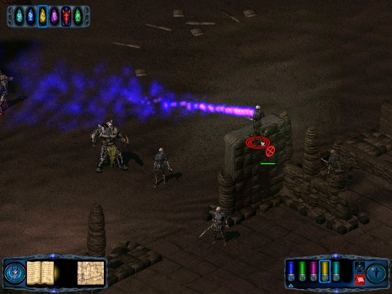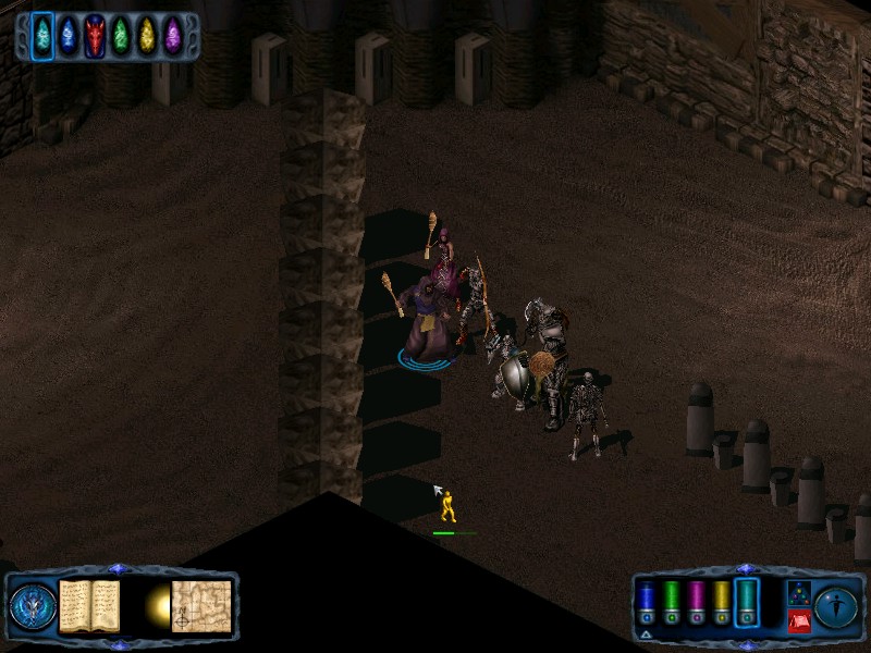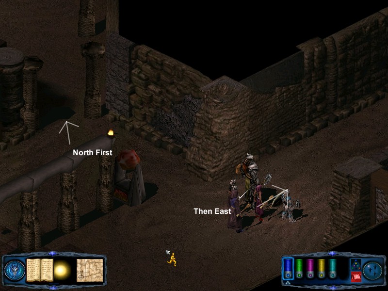Exit the library through the passage in the NE and follow it until you come to a partial barrier of pillars. Take care of the 2 skeleton knights and the skeleton that linger in this area, then turn south and head through the door. The door to your east leads to an area with a bookcase holding 2 shortbows, 2 shortswords, 2 quivers of arrows +1. The door south leads into a large, relatively open area.