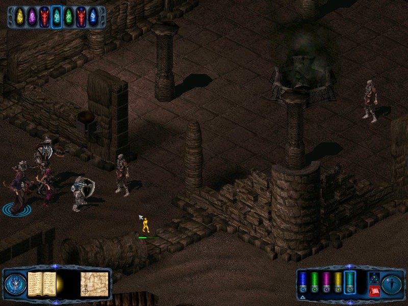 | Past the ruins, you will return to the main road. Heading to the north will return you to the junction we passed through earlier. Heading south takes you past the ruins that held the 4 skeletons to 2 zombies. Travelling south west from here, you will encounter a ghoul in some more ruins and two broken wells. Having arrived at the southwest corner of this area, turn east again, hugging the south wall. Bypass the door to the south for now and go instead to the room with the smoking fountain. Initially you will be attacked by two zombies, with another 3 attacking when you enter the room. Once they are killed a further 2 zombies attack from the south. | ![]() |