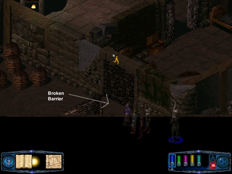 Squeeze past the barrier to the east and you will encounter a wounded lizrdfolk. Listen to him and he will mutter about undead, then die. At the same time two ghouls will attack from an adjoining room. Kill them and they will drop a handful of gold. In the room they emerged for you will find a handaxe +3, a large shield +1 and a Ghoul Stopper amulet on the floor. There is also a barrell holding a wand of ressurection and a phial of neutralize poison in the same room. |