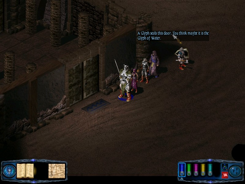 From the doorway follow the wall south west to discover the glyph of water on the floor. Mark this on your map then head SE until you reach a door, beyond which are some stairs leading down. |