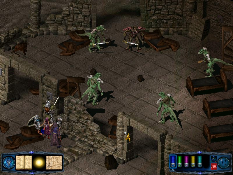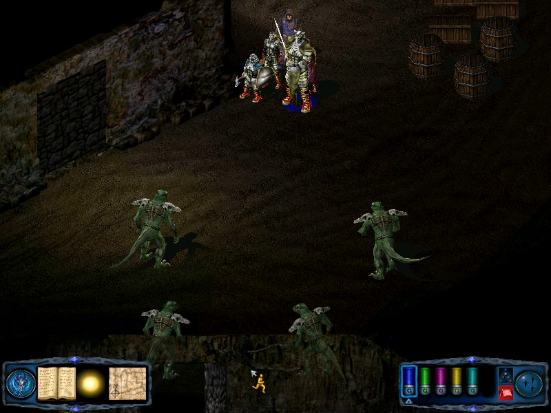 You have a choice of two doors, south and west, but both these doors lead to short passages which converge on an opening to the south. At this opening a fresh group of lizardfolk attack. This group consists of 3 scavengers, a warrior and a healer. This group were protecting a door that will lead your party back up to Stillwater. Follow the passage west, passed the door, to a junction. The route south leads to a dead end, so turn SW, and then SE when the passage turns. This time you have to take out 2 warriors, 2 scavengers and 2 healers. This group drop the silverleaf rod and the silverleaf hatchet. Behind them is a small room housing a barred door. You cannot proceed any further for now so it's time to return upstairs. |