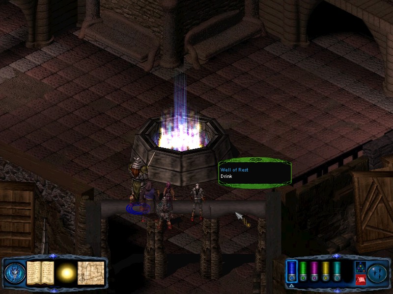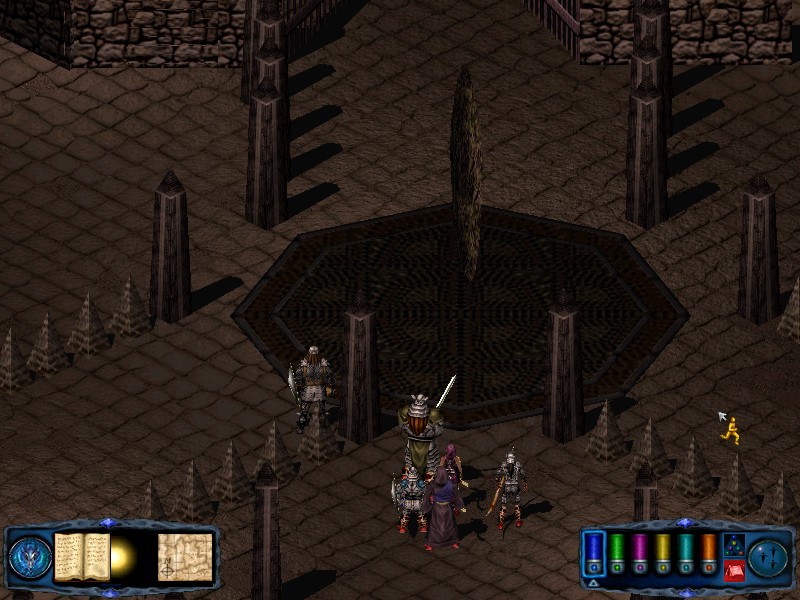 Continue moving north, passing some empty rooms to the west. Go east when the passage turns and you will emerge in another open area. At the center of this area there is a spinning spire. From the spire move travel N through the gates just behind it. |