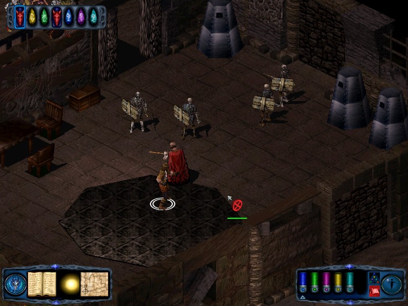 Exit the room and explore the open area beyond. There are doors in the NE and SE. Be cautious when you pass by the SE doors as a party of undead will come through them after you. This group consists of 2 skeleton elders, a skeleton lord and a skeleton knight. When you have defeated them, grab thier gold then move up to the NE gates. Go into the room beyond and read the note on the right and the note on the left as well as taking the gold from the chest. |