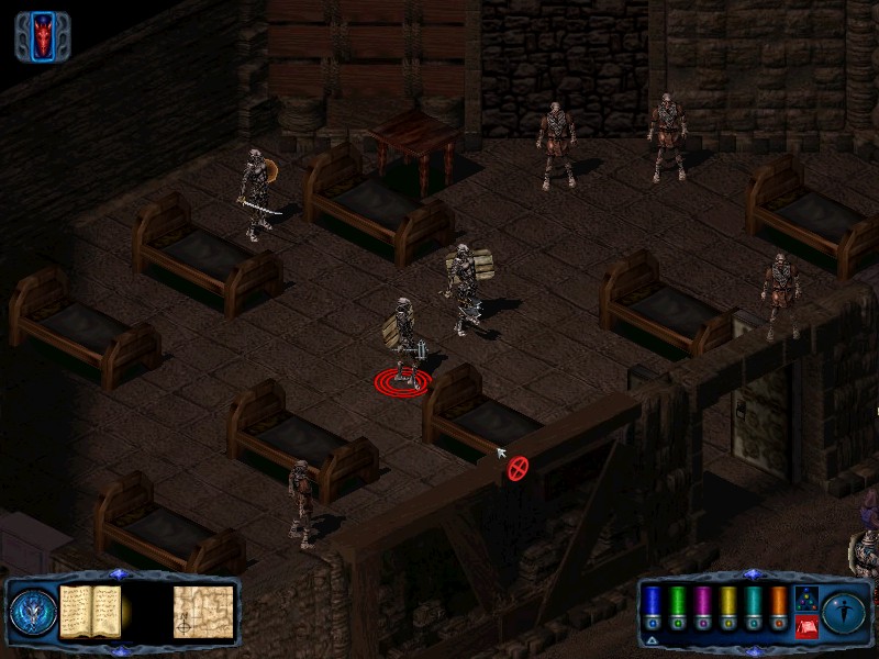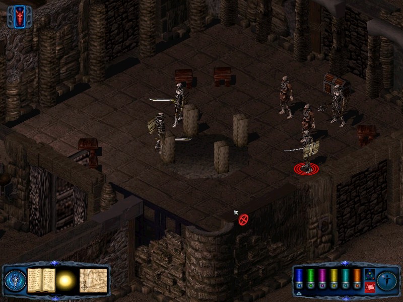 Continue moving west, turning southwards with the passage to reach another junction. Again, take the west route into a skinny passage. The first door to the south opens onto an empty room, whilst the second holds a Scroll of Dispel Magic. The room to the north of the passage is home to 4 ancient zombies and 3 skeleton knights. This group drops a potion of serious healing.