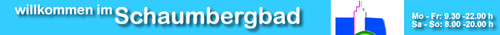 4 für 2Ferientarif im Schaumbergbadvom 27.6. - 7.8.2002Auch in diesem Jahr wieder: unser Spar- und Spaßtarif während der Sommerferien. Sie bleiben 4 Stunden, zahlen aber nur für 2 Stunden; egal, ob Sie uns allein, mit der Familie oder mit einer Gruppe besuchen. Die Vergünstigung gilt für alle. Wir haben geschlossenvom 2. bis 7. September 2002Einmal im Jahr müssen wir unser Bad für Wartungs- und Unterhaltungsarbeiten schließen, und zwar von Montag, 2. bis einschließlich Samstag, 7. Sept. 2002. Wir erweitern den AussenbereichEin Erlebniswanderweg entsteht rund ums Bad. Mehr dazu HIER Diese Seite wurde seit Jan 1997 19-mal aufgerufen |