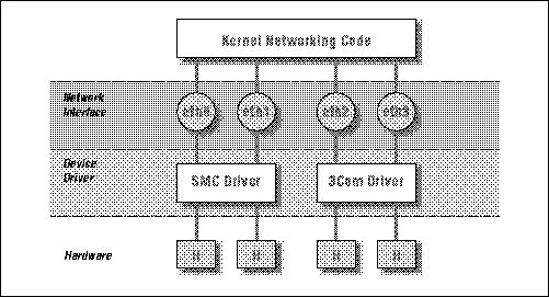 Wie in Kapitel 2, Aspekte der Netzwerarbeit mit TCP/IP beschrieben, spricht der Kernel ein Gerät durch eine sogenannte Schnittstelle oder Interface an. Interfaces bieten einen Satz abstrakter Funktionen, der für alle Arten von Hardware gleich ist, wie zum Beispiel das Senden oder Empfangen eines Datagramms.