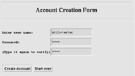 <title>Create New Account</title><center><hr><h1>Account Creation Form</h2><hr></center><form method="post" action="/cgi-bin/create.pl"><pre><b>Enter user name: <INPUT NAME="user" MAXLENGTH="20" SIZE="20">Password: <INPUT NAME="pass1" TYPE="password"MAXLENGTH="20" SIZE="20">(Type it again to verify) <INPUT NAME="pass2" TYPE="password"MAXLENGTH="20" SIZE="20"></b></pre><INPUT TYPE="submit" VALUE="Create account"><input type="reset" value="Start over"></form>the browser view looks like that in Figure 3-4.