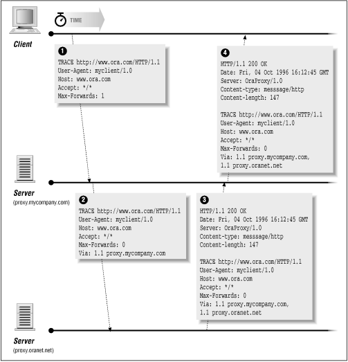 - TRACE asks that proxies declare themselves in the headers, so the client can learn the path that the document took (and thus determine where something might have been garbled or lost).