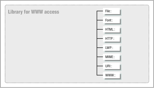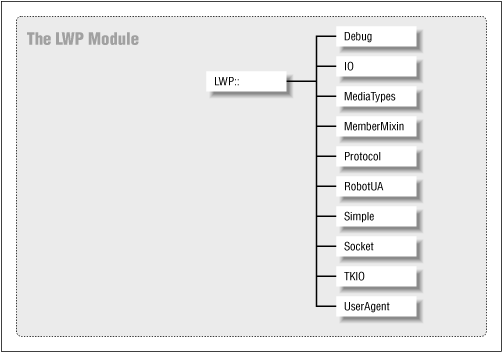 There are eight main modules in LWP: File, Font, HTML, HTTP, LWP, MIME, URI, and WWW. Figure 5-1 sketches out the top-level hierarchy within LWP.